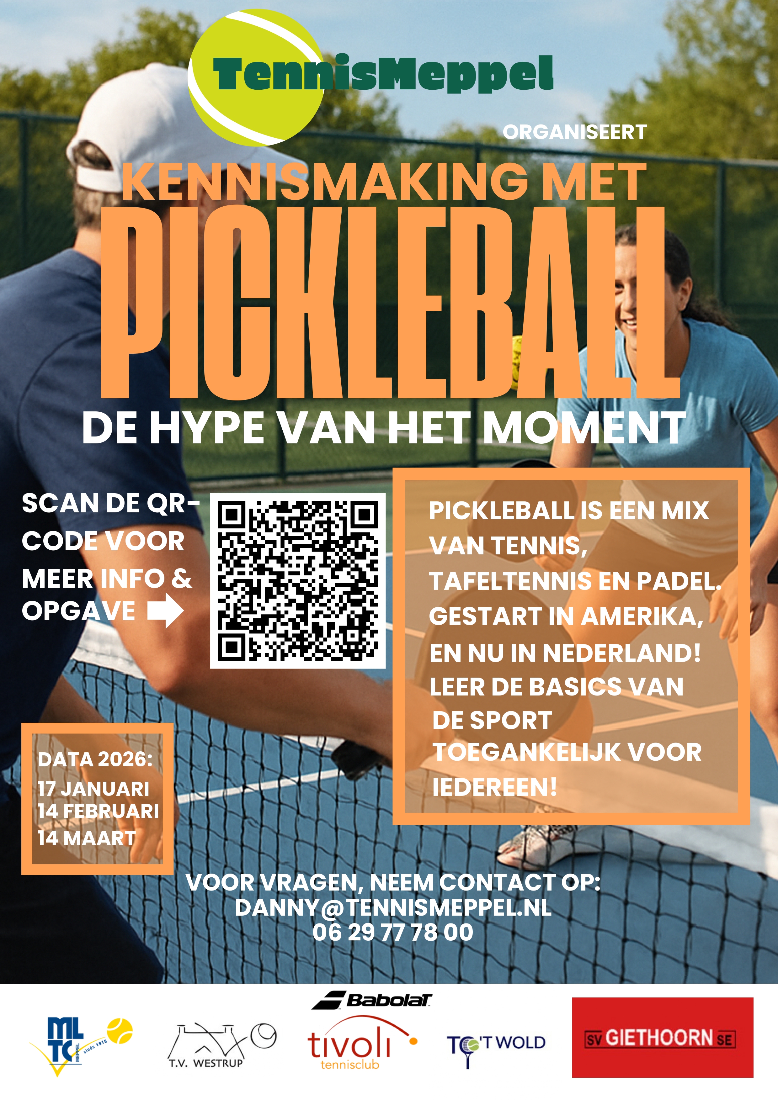 Onze tennisschool TennisMeppel organiseert in de eerste drie maanden van 2026 pickleball clinics voor iedereen die het leuk vindt om deze sport eens te proberen. Pickleball is een mix van tennis, tafeltennis en padel, gestart in Amerika en nu in Nederland. Zie onderstaande poster of klik hier voor meer informatie.